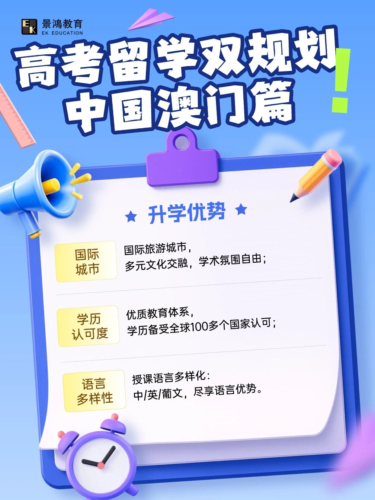 🇲🇴中国澳门近年来成为亚洲升学的热门之地,拥有离家近、方便快捷、英文授课程度高、学分被全球认可、费用比国外低等优势。