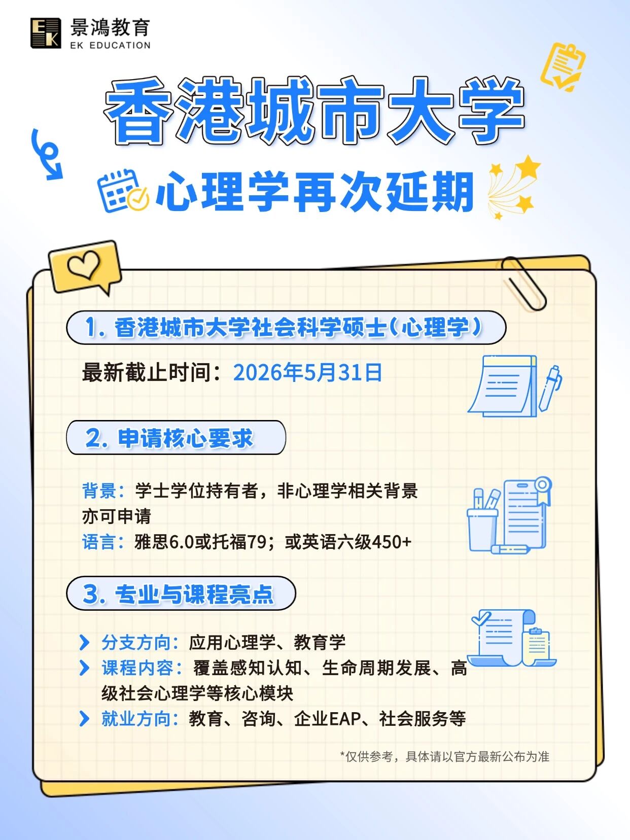 🇭🇰香港城市大学宣布,社会科学硕士(心理学)再次延期!最新截止时间:2026年5月31日