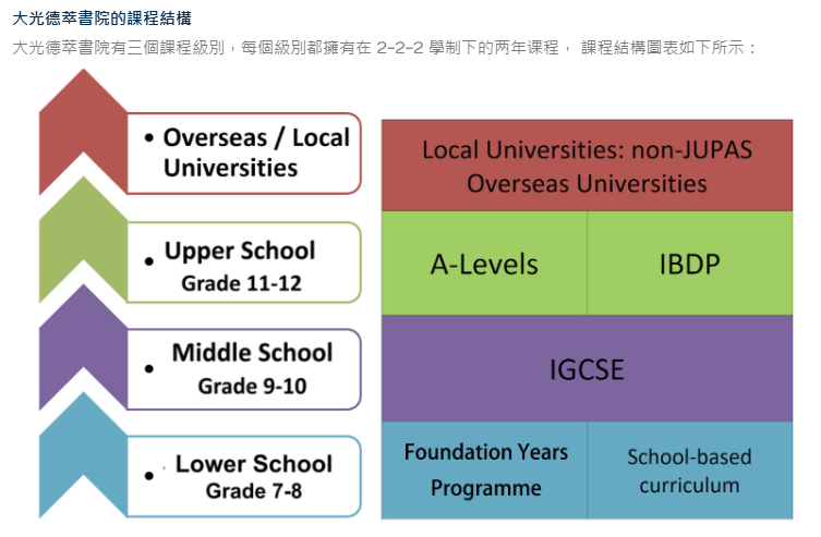 大光德萃书院提供三阶段教育给7-12年级(中一至中六)的学生,7至8年级以校本课程打好国际教育基础;9至10年级推行国际普通中学教育文凭(IGCSE)课程;11至12年级提供IBDP和A-Level双轨课程。